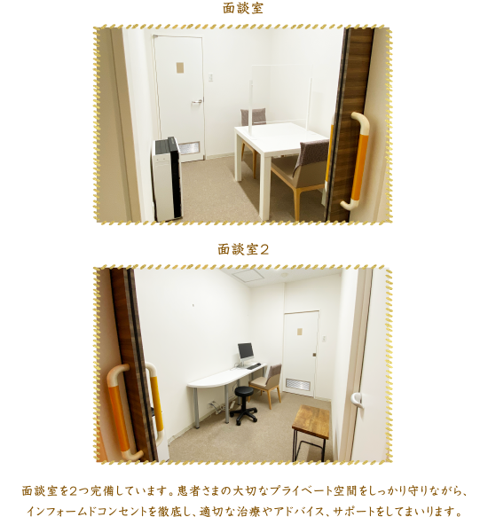 面談室を2つ完備しています。患者さまの大切なプライベート空間をしっかり守りながら、インフォームドコンセントを徹底し、適切な治療やアドバイス、サポートをしてまいります。