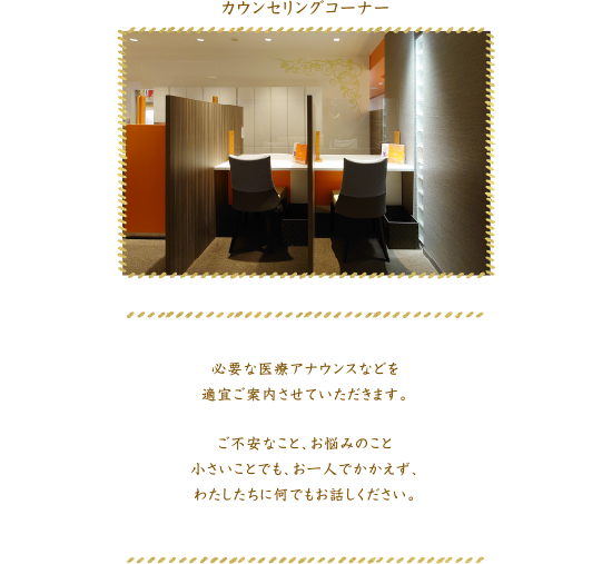 カウンセリングコーナー 必要な医療アナウンスなどを適宜ご案内させていただきます。ご不安なこと、お悩みのこと小さいことでも、お一人でかかえず、わたしたちに何でもお話しください。