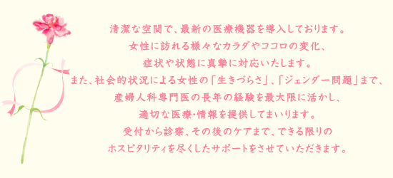 清潔な空間で、最新の医療機器を導入しております。女性に訪れる様々なカラダやココロの変化、症状や状態に真摯に対応いたします。また、社会的状況による女性の「生きづらさ」、「ジェンダー問題」まで、産婦人科専門医の長年の経験を最大限に活かし、適切な医療・情報を提供してまいります。受付から診察、その後のケアまで、できる限りのホスピタリティを尽くしたサポートをさせていただきます。