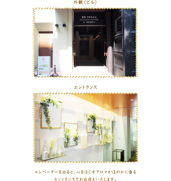 エレベーターを出ると、心をほぐすアロマがほのかに香るエントランスでお出迎えいたします。