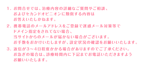 お問合せフォーム お名前(漢字) お名前(ひらがな) 電話番号・携帯番号 - - メールアドレス ※受信可能なメールアドレスをご入力ください。 メールアドレス(確認用) ※確認のためもう一度メールアドレスをご入力ください。 お問合せ内容 メールフォームによる個人情報取り扱いについて お問合せ業務に必要な、氏名・メールアドレスなどの個人情報の入力を必須とさせていただいております。 ご提供いただいた個人情報は、当院のお問合せ業務にのみ使用し、その他の目的には一切使用いたしません。 また、個人情報を当院から第三者に提供することも一切いたしません。 個人情報取り扱いについての同意 ご同意いただける場合は、「同意する」にチェックし、「送信」ボタンを押してください。
