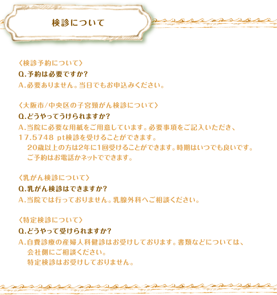 検診について 〈検診予約について〉Q.予約は必要ですか?A.必要ありません。当日でもお申込みください。〈大阪市/中央区の子宮頸がん検診について〉Q.どうやってうけられますか?A.当院に必要な用紙をご用意しています。必要事項をご記入いただき、検診を受けることができます。20歳以上の方は2年に1回受けることができます。時期はいつでも良いです。ご予約はお電話かネットでできます。〈乳がん検診について〉Q.乳がん検診はできますか?A.当院では行っておりません。乳腺外科へご相談ください。〈特定検診について〉Q.どうやって受けられますか?A.自費診療の産婦人科健診はお受けしております。書類などについては、会社側にご相談ください。特定検診はお受けしておりません。