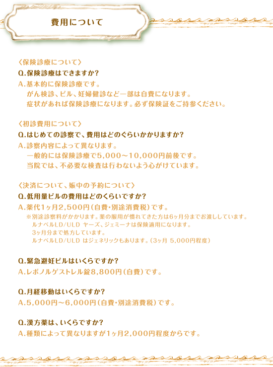 費用について 〈保険診療について〉Q.保険診療はできますか?A.基本的に保険診療です。がん検診、ピル、妊婦健診など一部は自費になります。症状があれば保険診療になります。必ず保険証をご持参ください。〈初診費用について〉Q.はじめての診察で、費用はどのぐらいかかりますか?A.診察内容によって異なります。一般的には保険診療で5,000~10,000円前後です。当院では、不必要な検査は行わないよう心がけています。〈決済について、娠中の予約について〉Q.低用量ピルの費用はどのくらいですか?A.薬代1ヶ月2,500円(自費・別途消費税)です。※別途診察料がかかります。薬の服用が慣れてきた方は6ヶ月分までお渡ししています。 ルナベルLD/ULD ヤーズ、ジェミーナは保険適用になります。3ヶ月分まで処方しています ルナベルLD/ULD はジェネリックもあります。(3ヶ月 5,000円程度)Q.緊急避妊ピルはいくらですか?A.レボノルゲストレル錠8,800円(自費)です。Q.月経移動はいくらですか?A.5,000円~6,000円(自費・別途消費税)です。Q.漢方薬は、いくらですか?A.種類によって異なりますが1ヶ月2,000円程度からです。