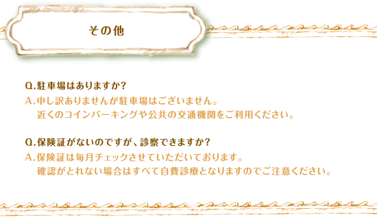 その他 Q.駐車場はありますか?A.申し訳ありませんが駐車場はございません。近くのコインパーキングや公共の交通機関をご利用ください。Q.保険証がないのですが、診察できますか?A.保険証は毎月チェックさせていただいております。確認がとれない場合はすべて自費診療となりますのでご注意ください。