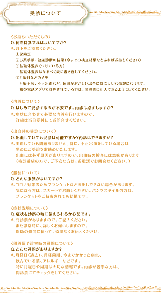 受診について 〈お持ちいただくもの〉Q.何を持参すればよいですか?A.以下をご持参ください。①保険証②お薬手帳、健康診断の結果(今までの検査結果などあればお持ちください)③基礎体温表(つけている方) 基礎体温表はなるべく表に書き直してください。④月経日などのメモ 月経不順、不正出血など、体調がおかしい場合に特に大切な情報になります。 携帯電話アプリで管理されている方は、問診票に記入できるようにしてください。〈内診について〉Q.はじめて受診するのが不安です。内診は必ずしますか?A.問診票に内診を希望しないチェック欄があります。苦手な方やご不安な方は、チェックや問診票にご記入ください。診察で必要のない内診はおこないません。〈出血時の受診について〉Q.出血していても受診は可能ですか?内診はできますか?A.出血していも問題ありません。特に、不正出血をしている場合は早めにご受診をお勧めいたします。出血には必ず原因がありますので、出血時の検査には意味があります。(検診希望の方で、ご不安な方は、お電話でお問合せください。)〈服装について〉Q.どんな服装がよいですか?A.コロナ対策のためブランケットなどお出しできない場合があります。気になる方は、スカートでお越しください。パンツスタイルの方は、ブランケットをご持参されても結構です。〈症状説明について〉Q.症状を診察の時に伝えられるか心配です。A.問診票がありますので、ご記入ください。また診察時に、詳しくお伺いしますので、医師の質問に従って、遠慮なくお伝えください。〈問診票や診察時の質問について〉Q.どんな質問がありますか?A.月経日(過去)、月経周期、今までかかった病気、飲んでいる薬、アレルギーなどです。特に月経日や周期は大切な情報です。内診が苦手な方は、問診票にてチェックをしてください。