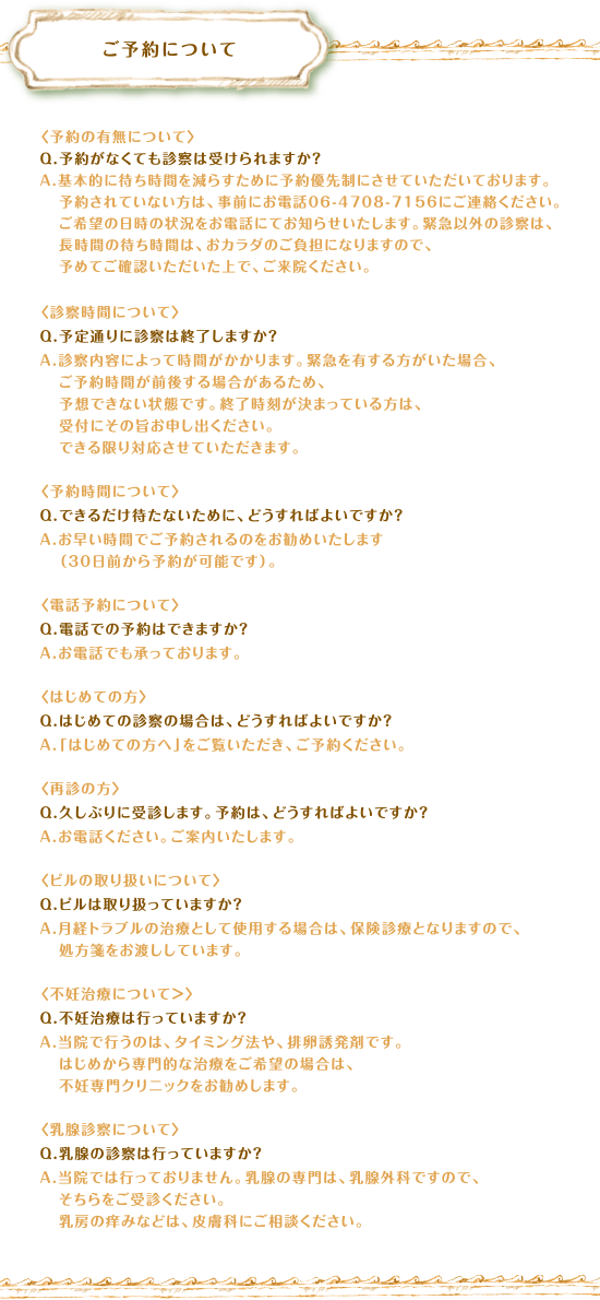 ご予約について 〈予約の有無について〉Q.予約がなくても診察は受けられますか?A.基本的に待ち時間を減らすために予約優先制にさせていただいております。予約されていない方は、事前にお電話06-4708-7156にご連絡ください。ご希望の日時の状況をお電話にてお知らせいたします。緊急以外の診察は、長時間の待ち時間は、おカラダのご負担になりますので、予めてご確認いただいた上で、ご来院ください。〈診察時間について〉Q.予定通りに診察は終了しますか?A.診察内容によって時間がかかります。緊急を有する方がいた場合、ご予約時間が前後する場合があるため、予想できない状態です。終了時刻が決まっている方は、受付にその旨お申し出ください。できる限り対応させていただきます。〈予約時間について〉Q.できるだけ待たないために、どうすればよいですか?A.お早い時間でご予約されるのをお勧めいたします(30日前から予約が可能です)。〈電話予約について〉Q.電話での予約はできますか?A.お電話でも承っております。〈はじめての方〉Q.はじめての診察の場合は、どうすればよいですか?A.「はじめての方へ」をご覧いただき、ご予約ください。〈再診の方〉Q.久しぶりに受診します。予約は、どうすればよいですか?A.お電話ください。ご案内いたします。〈ピルの取り扱いについて〉Q.ピルは取り扱っていますか?A.月経トラブルの治療として使用する場合は、保険診療となりますので、処方箋をお渡ししています。〈不妊治療について>〉Q.不妊治療は行っていますか?A.当院で行うのは、タイミング法や、排卵誘発剤です。はじめから専門的な治療をご希望の場合は、不妊専門クリニックをお勧めします。〈乳腺診察について〉Q.乳腺の診察は行っていますか?A.当院では行っておりません。乳腺の専門は、乳腺外科ですので、そちらをご受診ください。乳房の痒みなどは、皮膚科にご相談ください。